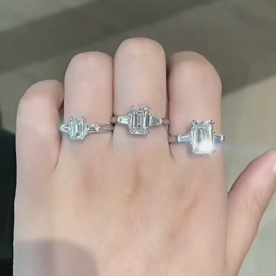 Three Stone Diamond Ring Set in 18K Gold or Platinum. Featuring an IGI certified Emerald diamond of D-F color, VVS-VS clarity.